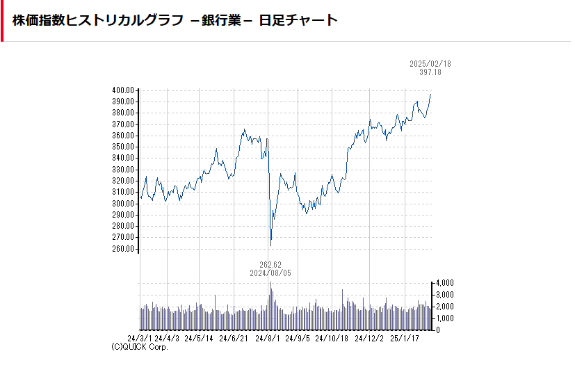 銀行株セクターの値動きを代表するものとして、株価指数(銀行業)のヒストリカルグラフをみてみましょう。